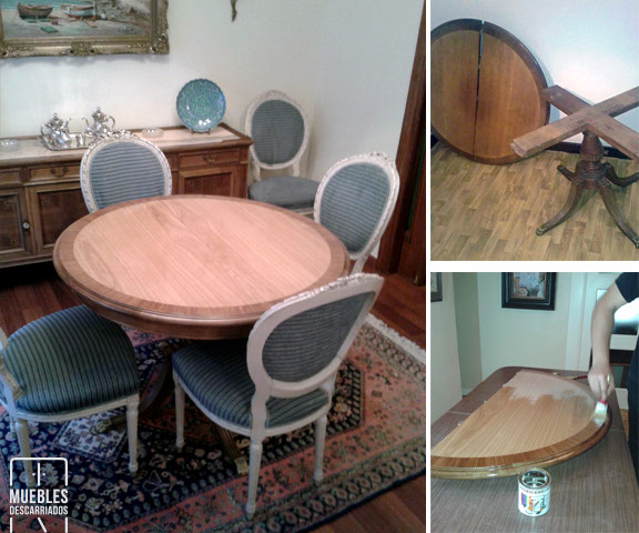 Mesa de comedor extensible. Limpieza de madera, sustitución de chapado en tablero y barnizada. Encargo.