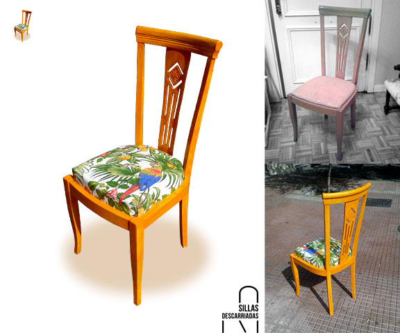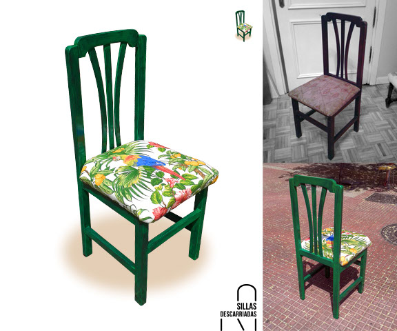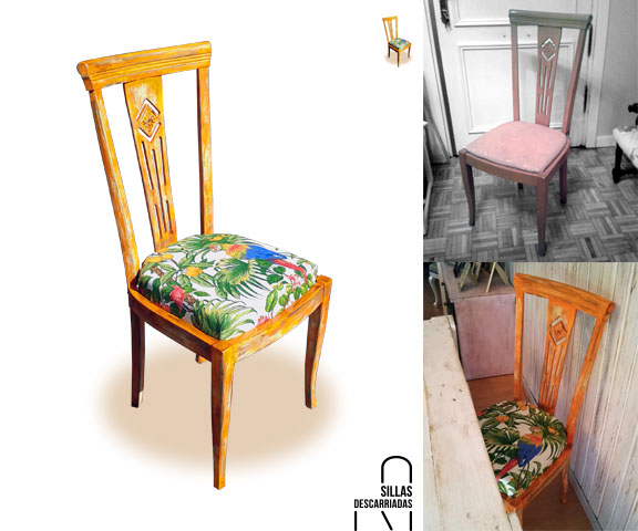 Silla 70s. Madera pintada al esmalte, tapizada con print de loros. Adquirida.
