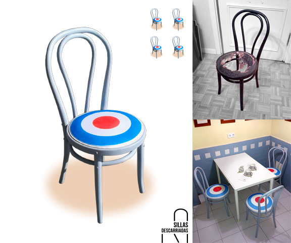 Cuatro sillas Thonet. Madera pintada a la tiza, tapizadas con loneta decorada con aerosol. Adquiridas.