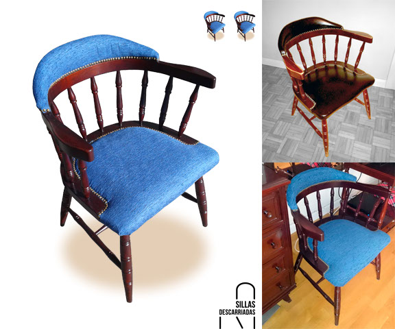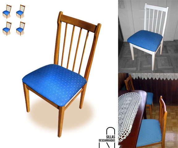 Cuatro sillas Mocholí. Arreglo completo y tapizado de asientos en chenilla de dos azules. Encargo.