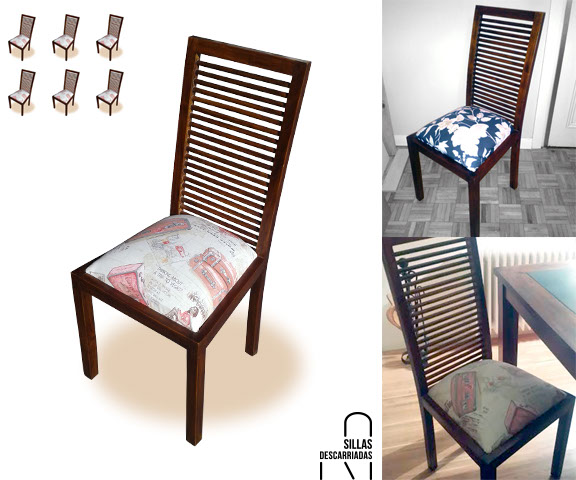 Seis sillas de comedor, madera borrada y tapizadas con loneta print. Encargo.