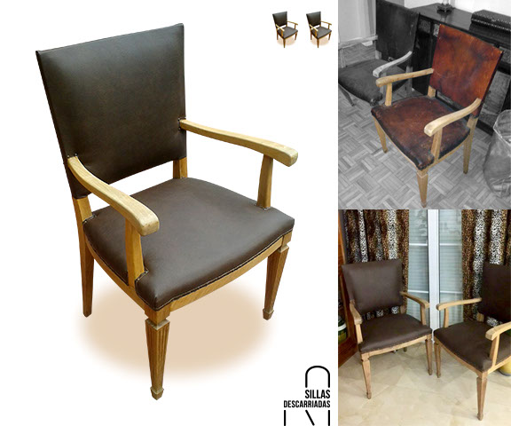 Sillas Luis XVI de brazos. Madera nudé y encerada, tapizada con polipiel y rematada con tachuelas. Encargo.