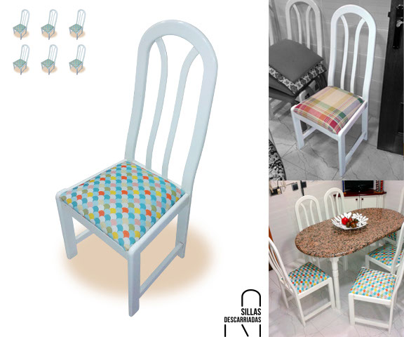 Seis sillas de comedor. Pintadas a la tiza y tapizadas. Encargo.