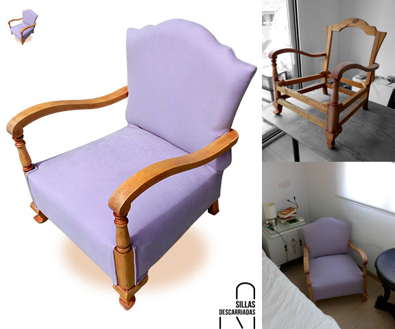 Butaca descalzadora. Tapizada en loneta lavanda. Encargo.