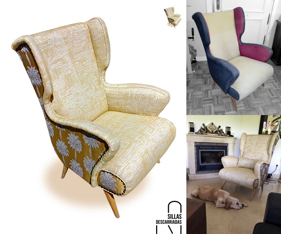Silón orejero años 50. Tapizado en jacquard de palmeras y chenilla jaspeada. Encargo.
