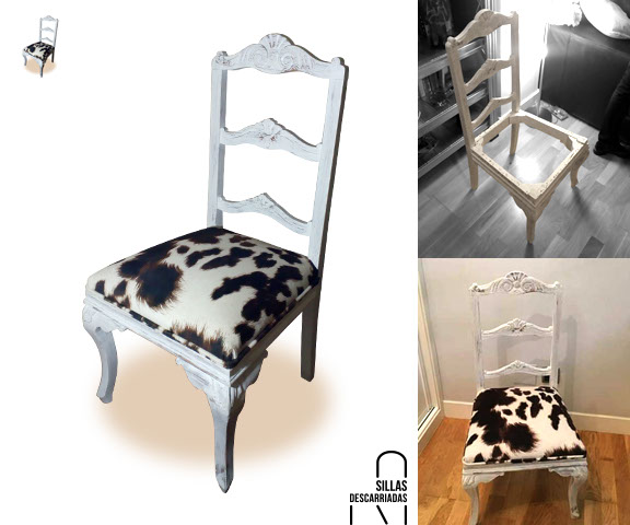 Silla costura. Madera pintada a la tiza, tapizada en alcántara print de vaca. Encargo.