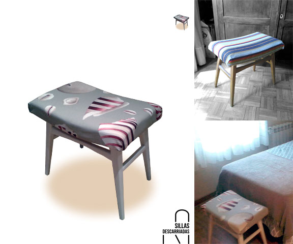 Escabel mecedora. Madera reparada y barnizada, tapizado en otomán. Encargo.