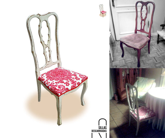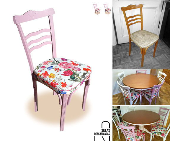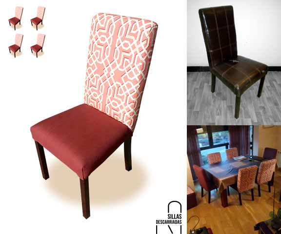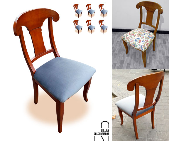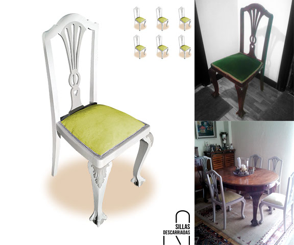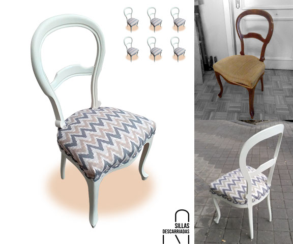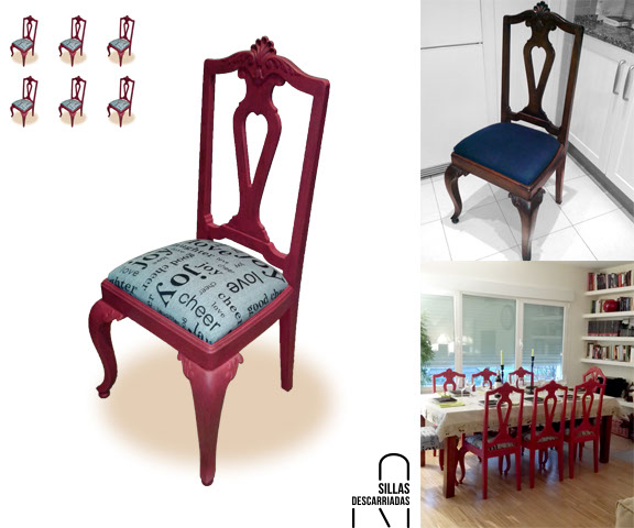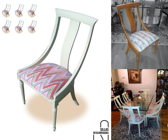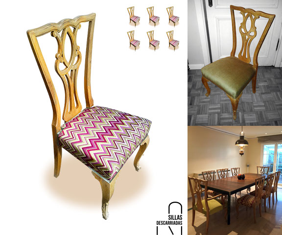 Seis sillas de comedor. Pintadas a la tiza y tapizadas. Encargo.
