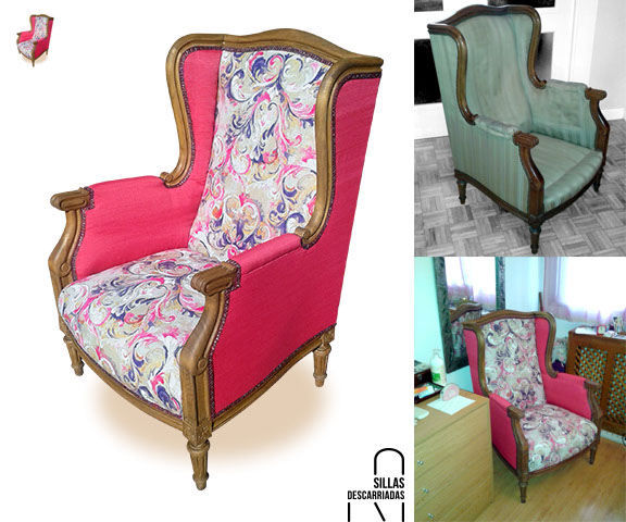 Sillón orejero colonial. Carpintería y limpieza de madera, tapizado con tres telas. Encargo.