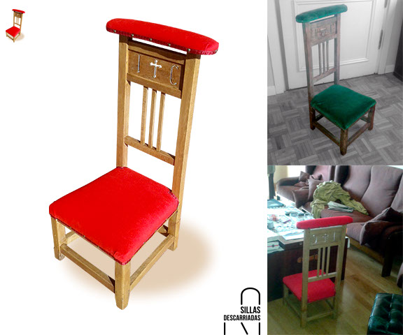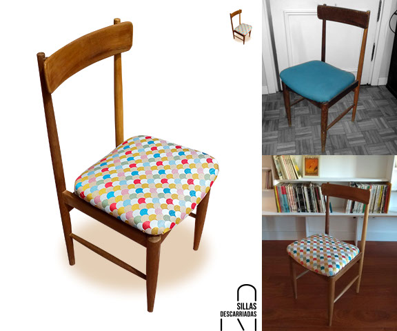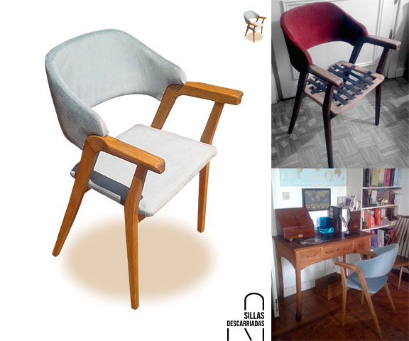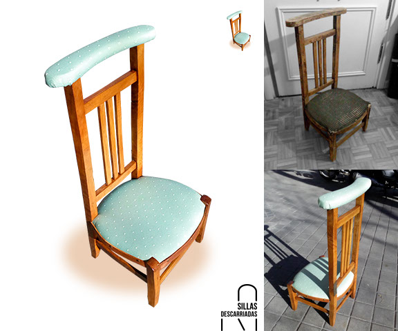 Primera silla, marca Mocholí años 50s. Madera pintada al esmalte, tapizada en lona. Adquirida.