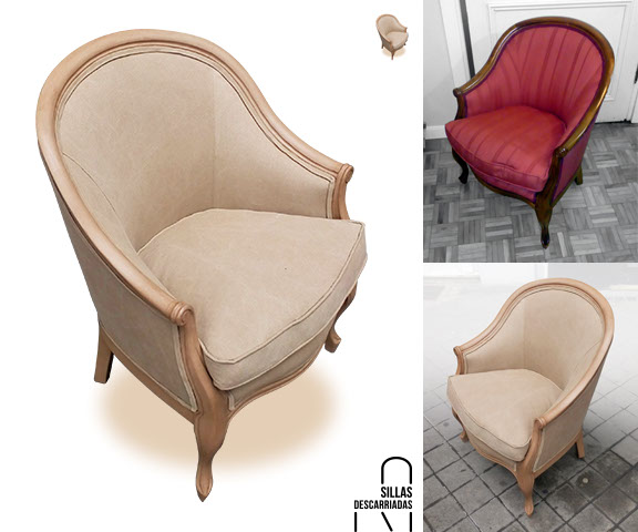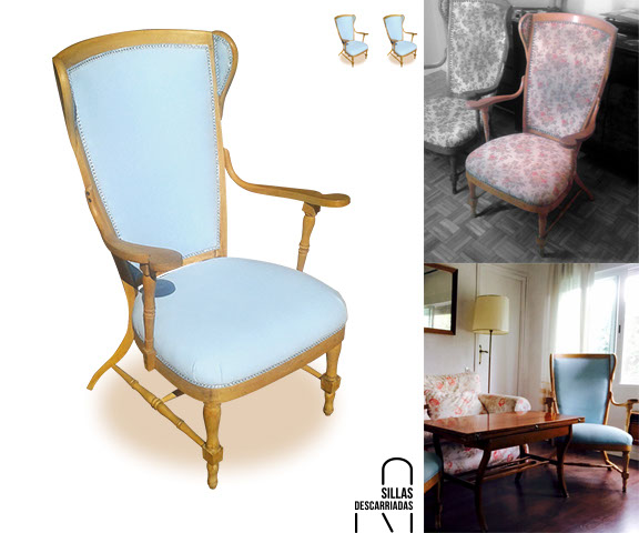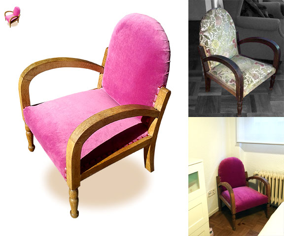 Butaca descalzadora. Reparación y madera nudé encerada, rellenos y tapizado. Encargo.