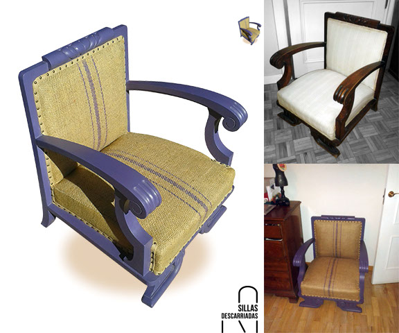 Butaca decó. Madera pintada a la tiza, tapizada con saco de yute con remate de lona y tachuelas. Encargo.