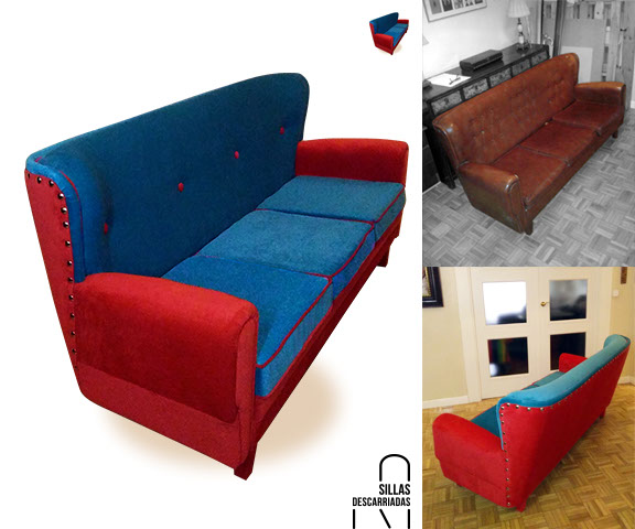 Sofá años 60s. Tapizado en cheviot con motas de colores, botones y vivos en chenilla roja y patas pintadas a la tiza en rojo rubí. Rematada con tachuelas de 16mm. Encargo.