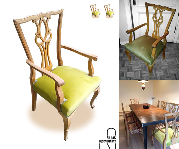 Seis sillas Chippendale. Madera pintada a la tiza en dos tonos. Tapizadas en terciopelo verde fluor. Encargo.