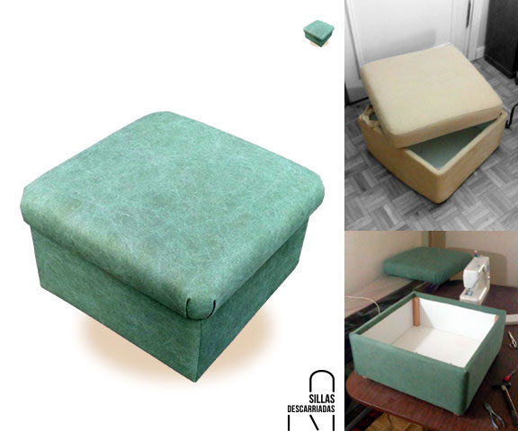 Puf con cajón. Tapizado en lona vaquera verde desgastado. Encargo.