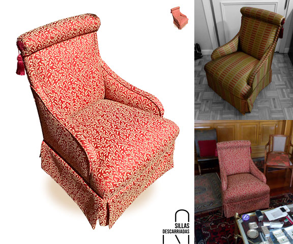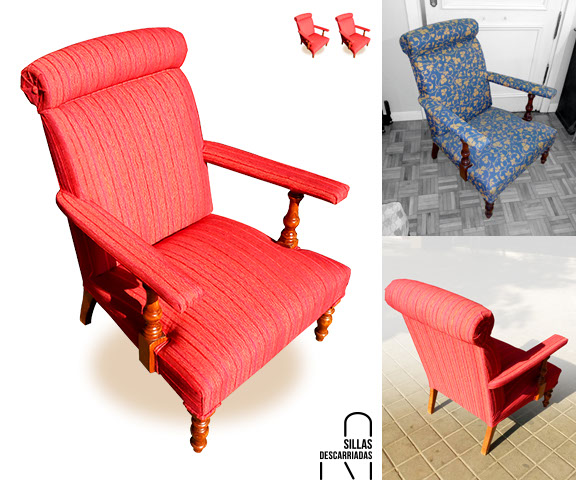 Dos butacas castellanas. Tapizadas en raso rojo de rayas bordadas. Encargo.