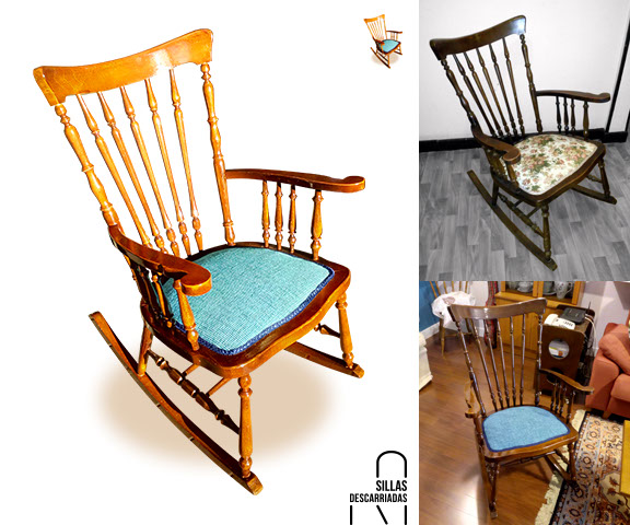 Mecedora. Tapizada en chenilla de dos azules y barnizada color roble. Encargo.