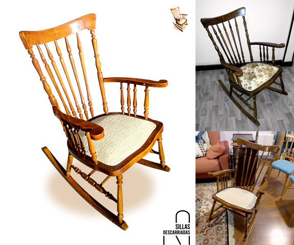 Mecedora. Tapizada en chenilla perla y barnizada color roble. Encargo.