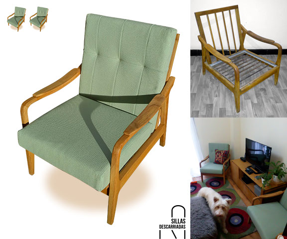 Dos butacas Felix Ortiz. Madera nudé y tapizadas con algodón rústico verde gris. Encargo.