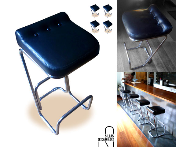 Cuatro taburetes metálicos, tapizados en skai negro. Encargo.