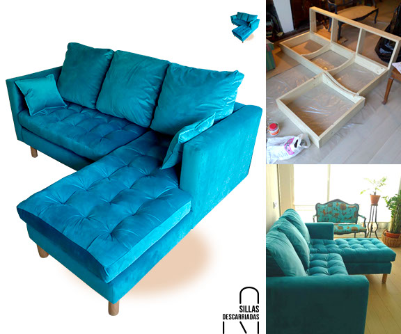 Sofá con chaise longue Blue Velvet. Construcción propia 100%, tapizado en terciopelo azul. Encargo.