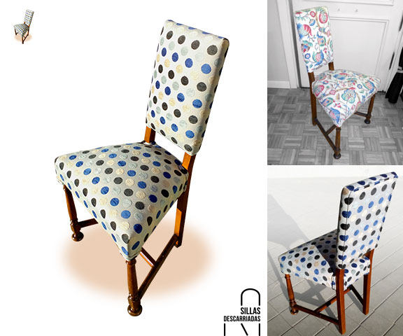 Silla nórdica, madera borrada y tapizada en gobelino de topos. Encargo.