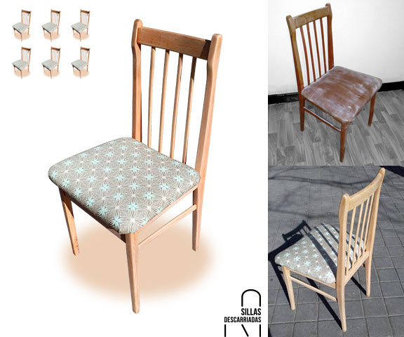 Seis sillas de comedor, madera borrada y tapizadas con loneta print. Encargo.