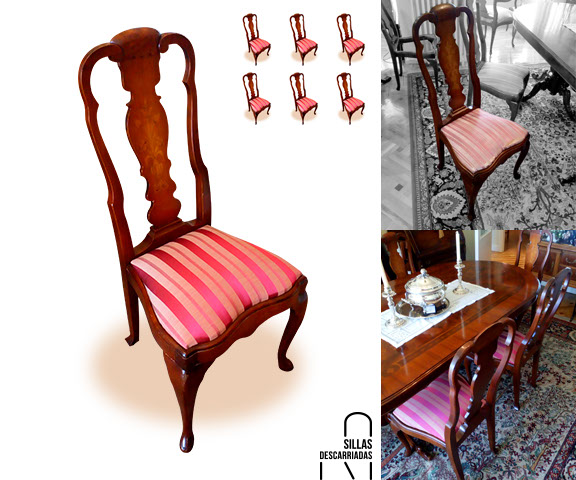 Sillas Reina Anne, seis asientos tapizados en rayón de franjas y espigas. Encargo.