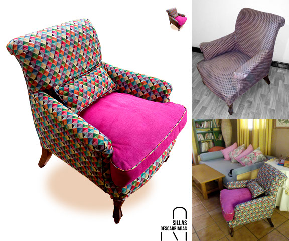 Dos butacas estilo español. Madera restaurada, rellenos nuevos y tapizado en loneta de geometrías. Adquiridas.