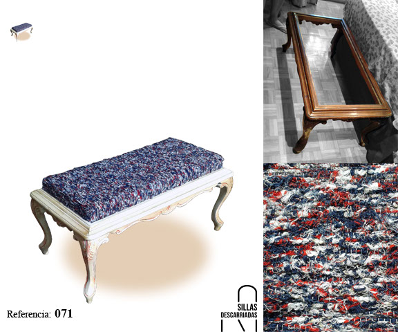 Banco a partir de mesa baja. Pintado en blanco bustaviano, tapizado con jarapa portuguesa. 120€.
