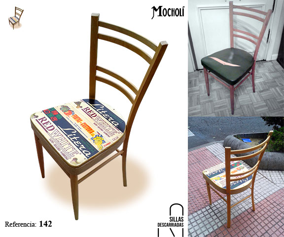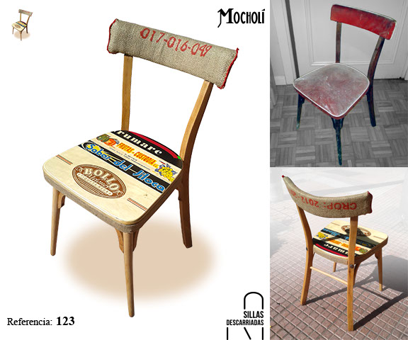 Silla Mocholí. Madera nudé encerada, asiento de madera laminada con cajas de fruta y barnizado, respaldo tapizado de saco de yute.100€.
