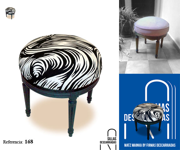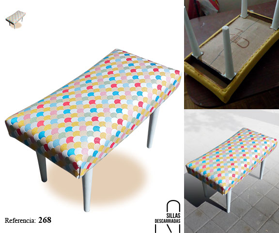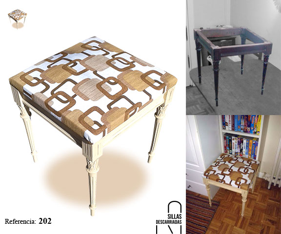 Escabel a partir de mesita baja. Madera pintada a la tiza, tapizada con tela de motivos años 60s. 40€.