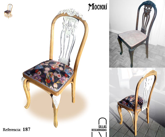 Silla Mocholí, Madera nudé combinada con pintura a la tiza y encerada, tapizada en seda japonesa. 120€. (Prototipo. Hay otras cuatro del mismo modelo por hacer).