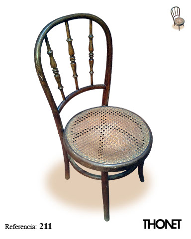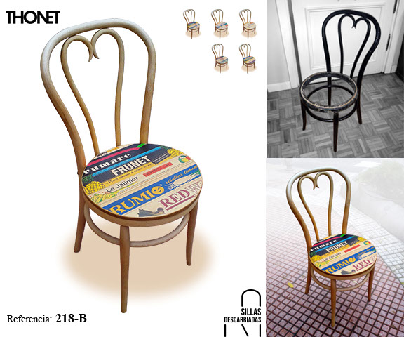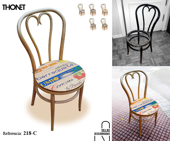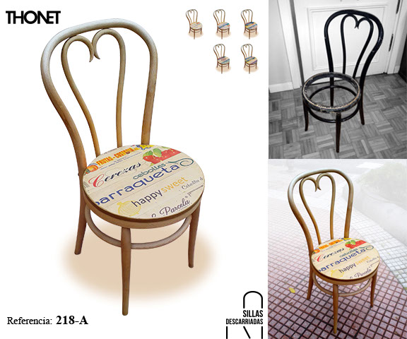 Cinco sillas Thonet. Madera acuchillada nudé y encerada, asientos diferentes de madera chapada con cajas de frutas. 90€ unidad.
