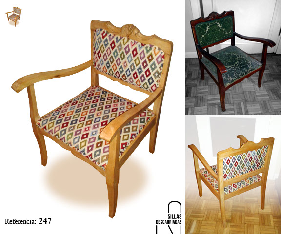 Butaca deconstruida. Madera tintada y encerada, tapizada en chenilla. 225€.