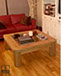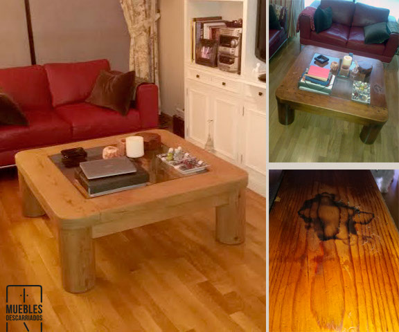 Mesa baja de salón. Limpieza, lijada y barnizada de poliuretano.