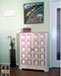 Sinfonier. Barnizado y pintura a la tiza blanca, interior de cajones forrados de tela resinada de flamencos.