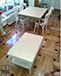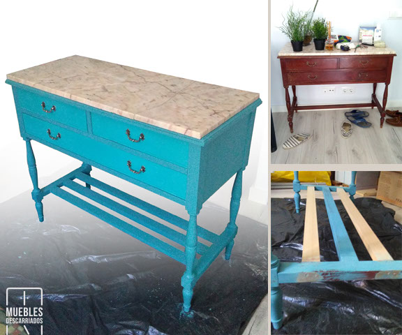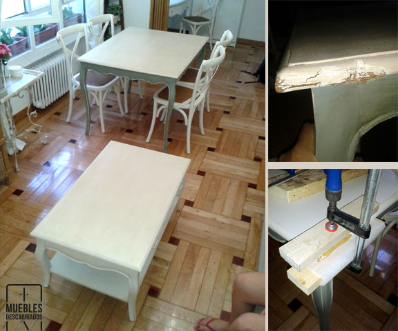Mesas. Reparación de tableros DM, pintura a la tiza barnizada con poliuretano.